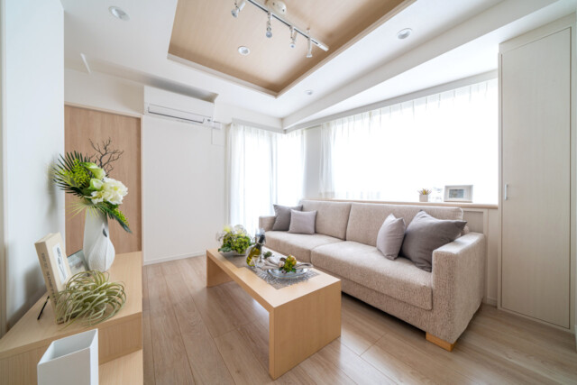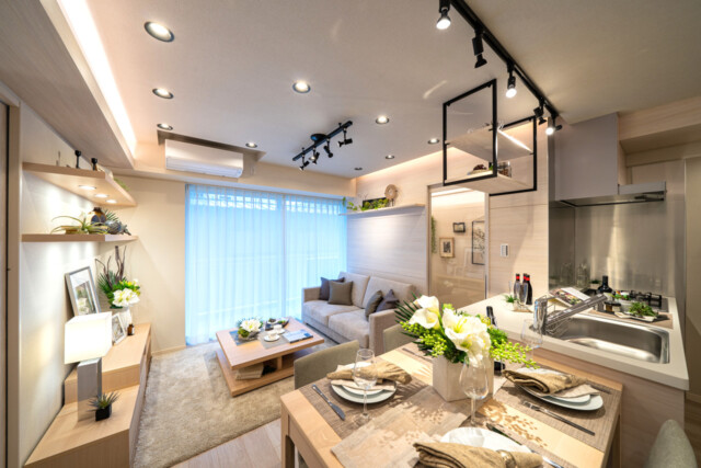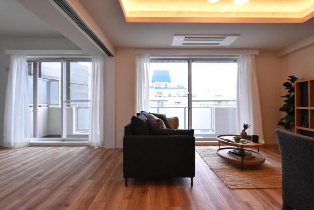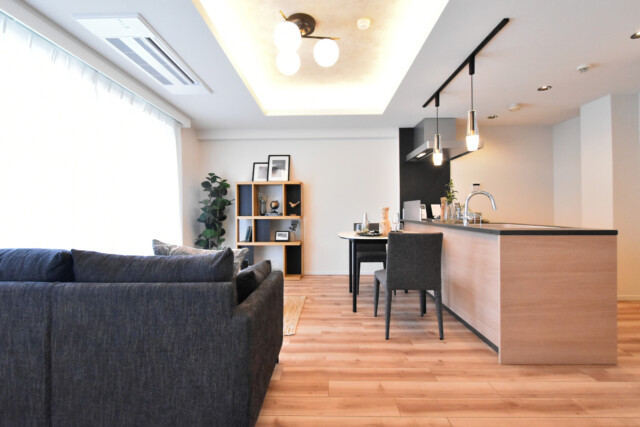 リビングダイニング部分には折り上げ天井。間接照明が組み込まれ柔らかくお部屋を照らしています。エアコンはインテリアの邪魔にならないビルトイン!