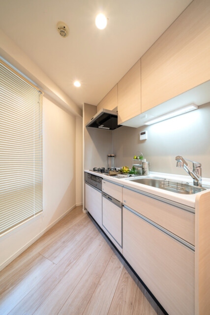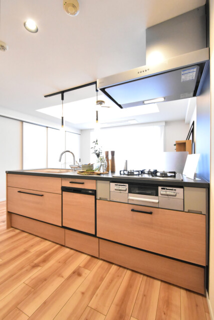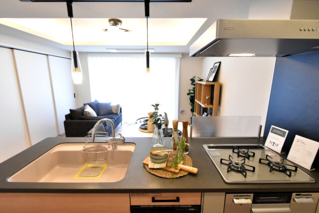 キッチンは対面式。水栓は浄水機能付き、コンロは3口ガスコンロと設備面も◎。