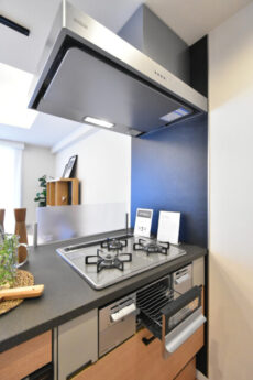 コンロは3口、グリル付き。今のガスコンロはタイマーや温度設定も出来るんですね。いつの間にって感じです。火を使うときは換気扇を忘れずに!少し前から回すと効果的らしいですよ。