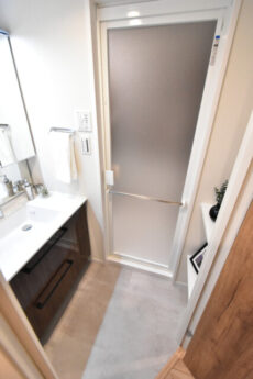 洗面室には洗面化粧台と浴室がまとまっていて脱衣所も兼ねています。間取り図にはありませんが、入って右の三角の部分には棚が付けられていました。ちょっとしたスペースも無駄にしないのはいいですね。