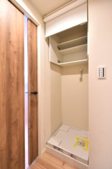 シューズボックスは収納力のあるトールタイプ。棚の高さを調節すればブーツやヒールなどの背の高い靴もきれいに並びます。廊下を進んだ突き当り右側は洗濯機スペースになっていました。洗剤などのランドリー用品が置けるよう中には吊戸棚付き。普段はロールスクリーンを下ろしておけば生活感もシャットアウト出来ますよ。