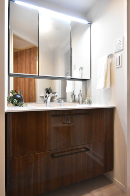 洗面化粧台はダークブラウンの鏡面仕上げで高級感たっぷり。三面鏡付きで身だしなみのチェックにも便利です。ミラー上部の照明のおかげで影になる心配もありません。低い位置に付けられたミドルミラーは小さなお子様でも使いやすく、歯磨きの習慣付けにも効果的だそうですよ。