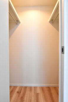 収納はウォークインクローゼット!両側に二本ハンガーパイプが付けられた広い収納です。衣装ケースなどで収納力アップもいいですし、衣類以外のかさばる物を入れておくのもよさそうですね。