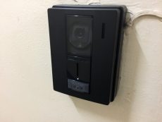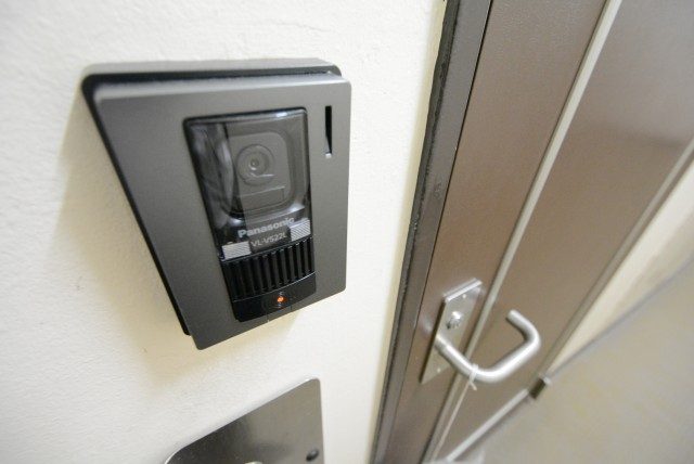 こちらのドアが今回ご紹介させていただくお部屋です。インターフォンはカメラ付き!防犯面もしっかりと。
