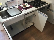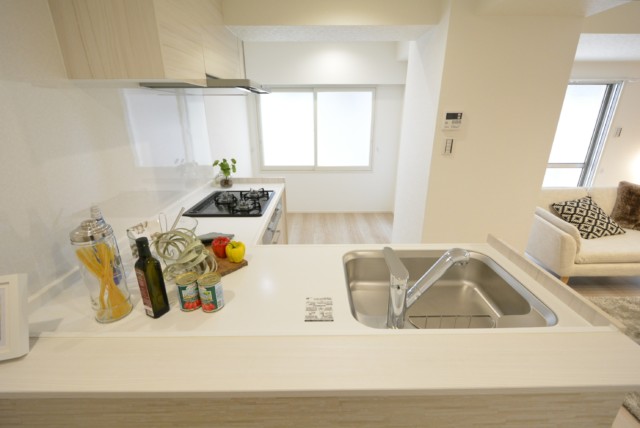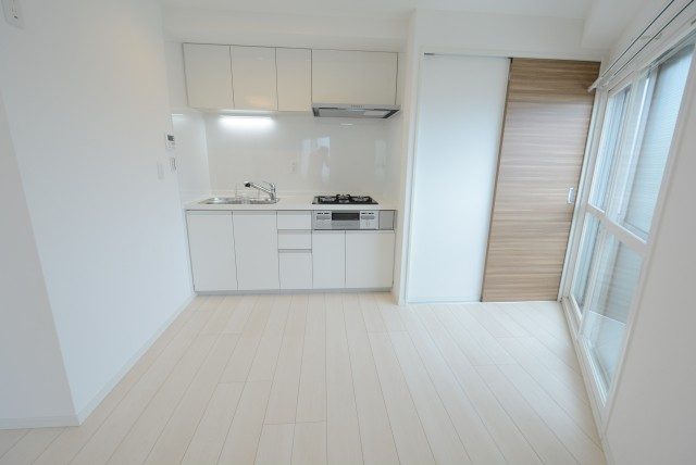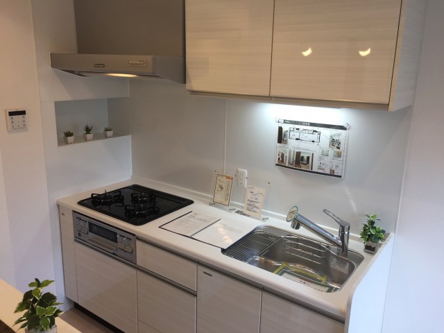キッチンを見てみます。キッチンは、お部屋にあわせた清潔感のある白いシステムキッチンです♪♪