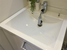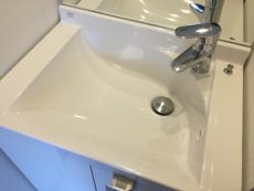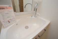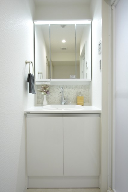 洗面化粧台は身だしなみチェックに便利な三面鏡付き。上部に照明が付いているので鏡を開けたときに影になることもありません。裏がキャビネットになっているので洗面周りの細々とした物もすっきり収納可能です。