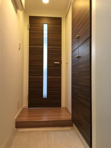 扉を開けると フルリノベーションを終え綺麗に生まれ変わった玄関がお出迎えです☆一部すりガラスになっているドアの向こうから光が差し込む玄関。