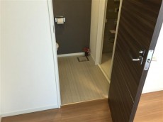 リビングダイニングキッチンから出入りする水回りを集めた洗面室です。段差も無くて、移動もスムーズ♪♪左手にトイレ、正面に洗面台、右手にバスルームの並びになっています。