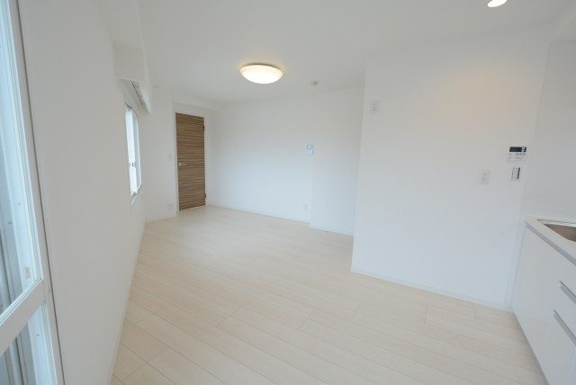 入ってすぐにキッチンがあり、その向こうにリビングダイニングが続く細長いお部屋です。明るめのフローリングと白いクロスというシンプルな色使いで、カーテンや家具なども合わせやすそうですね。サイズ的にリビングダイニング兼用にするのもアリだと思います。