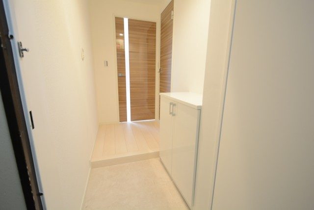 玄関を開けると、 フルリノベーションを終え綺麗に生まれ変わった玄関がお出迎えです☆玄関スペースには人感センサーがついているので、自動でパッと明かりもつきます。荷物を抱えている時など、助かりますね。