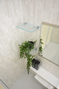 バスルームは、やさしい風合いの木調のパネル☆ミラー横のポケットにシャンプーボトルなどの小物をしまえば見た目も使い勝手もバッチリ◎