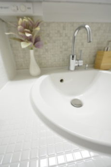 横には棚も付いているので小物を置くスペースもあります☆モザイクパターンの床は、水はけが良く、すばやく乾燥します。