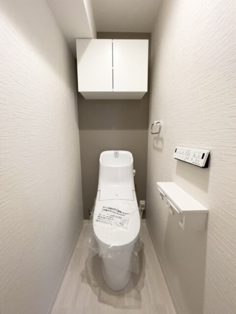 トイレはINAX製の洗浄機能一体型。トイレットペーパーストックや掃除道具を入れておくのに便利な吊り戸棚も付いています。