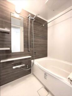 浴室は白を基調にダークブラウンのアクセントパネル。落ち着いた雰囲気でリラックスできそうですね。浴室換気乾燥機が付いているのでお天気を気にすることなく洗濯機を回せますよ。