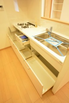 調理台の下は全て収納になっていました。それでも足りない場合は、後ろのスペースに冷蔵庫や家電ラックと共に食器棚を置きましょう。