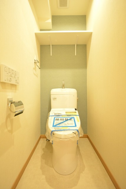 ゆったりとしたサイズのトイレです。棚も付ていてトイレットペーパーのストックなどもこちらへどうぞ。もちろん温水洗浄便座付き。TOTO製のウォシュレットです。