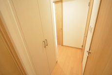 廊下を進むと収納棚。棚の高さが変えられるので、工夫次第でいろいろ入れられますよ。