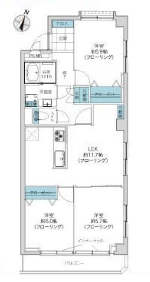 リビングダイニング、洋室に面したバルコニーは約7.51㎡、北東向き。
