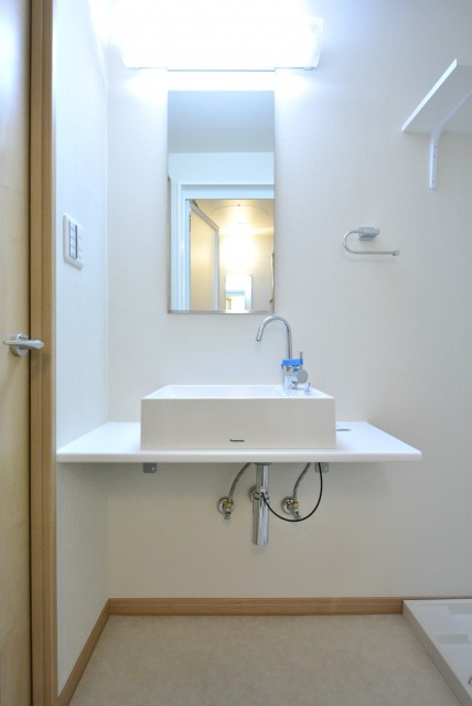 洗面台は既成ではなく造り付け。シンプルでいい感じです。収納がないので洗面ボウルの下や横のスペースを上手く使いましょう。