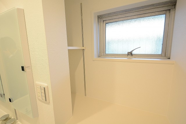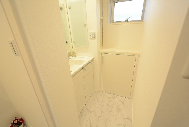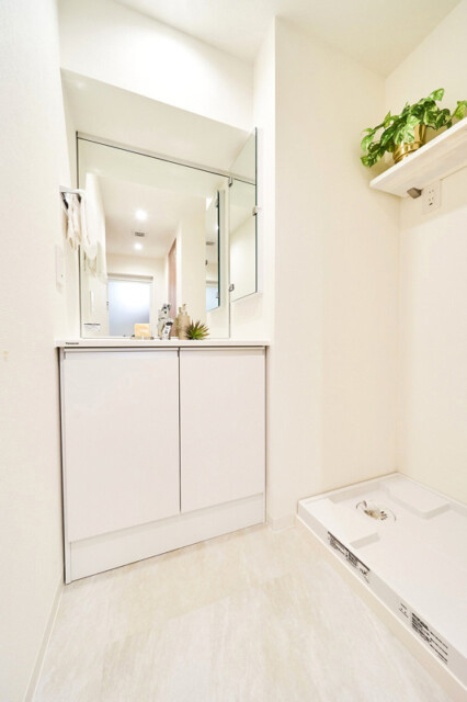 洗面室には洗面台、洗濯機スペース、トイレ、浴室がまとまっていて、脱衣所も兼ねています。Panasonic製洗面化粧台。ミラー扉のメディシンボックス付きで、洗面周りの細々したものを収納可能です。洗濯機スペースにも棚が付いているので、洗剤などの洗濯グッズはそちらへどうぞ。