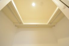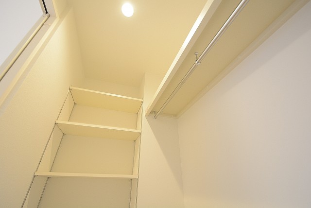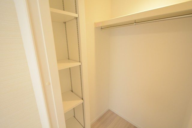 収納はウォークインクローゼット!!!棚とL字型にハンガーポールが設置された大きな収納です。衣装ケースなどを置けば収納力をアップさせることも可能ですし、衣類の他にもキャリーバッグやスーツケースなどの大きな物も余裕ですよ。