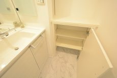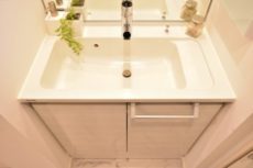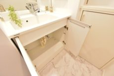 収納は洗面台下とミラーサイドのキャビネット。細々した物が多くなりがちな洗面廻りには、小さくて細かい収納が欠かせません。