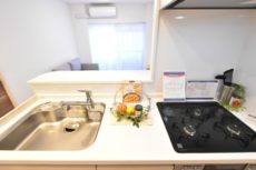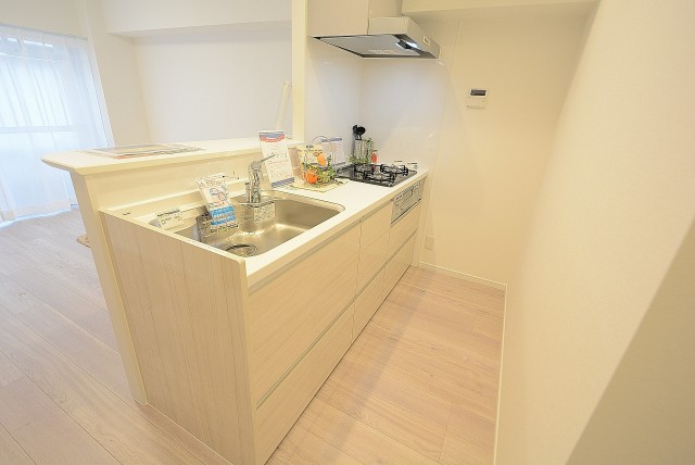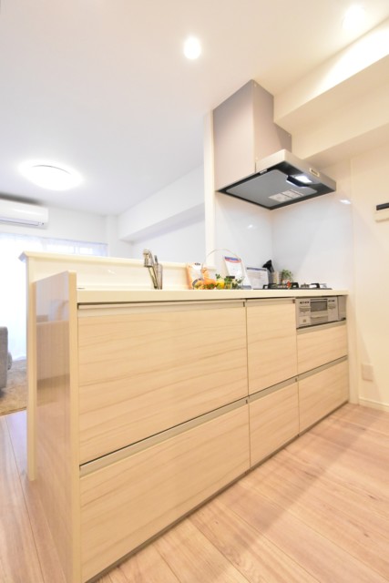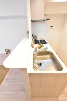 キッチンはカウンタータイプ。開放的で、お料理をしながらでも会話を楽しむことが出来ます。また、お部屋のテレビを見ながらなんてことも可能ですよ。