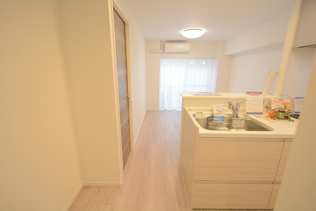 こちらは約10帖のリビング・ダイニング・キッチン。南東向きバルコニーに面した明るいお部屋です。シンプルな色使いで幅広い家具を合わせることが出来そうですね。お部屋が縦長なのでレイアウトもしやすそう。