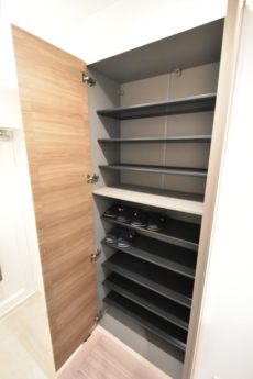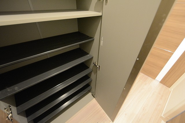 人感センサーが自動的にライトを点けてくれるので、暗い中手探りでスイッチを探す必要はありません。両手が塞がっている時などにはほんと助かります(^^)いつでも明るい玄関が迎えてくれるのも嬉しいですね。シューズボックスはトールタイプ。棚を調節すればブーツなども収納可能です。