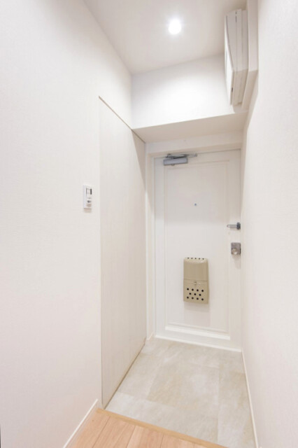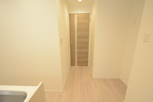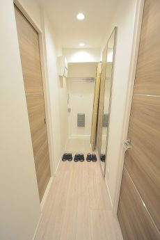 玄関から真っすぐ伸びる廊下は、ナチュラルカラーのフローリングと白のクロスの落ち着いた雰囲気。正面の扉に大きなすりガラスを使っていてお部屋からの光が入ってくるのもいいですね。