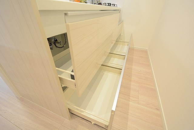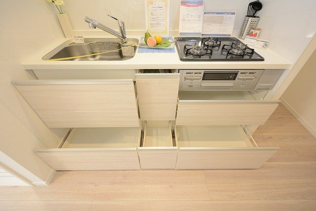 調理台下の収納は引き出し式のスライドキャビネット。出し入れがしやすく、ギッチリ詰めても収納物の確認がしやすい優れものです。調理台後ろにはあまりスペースがありませんが、冷蔵庫や家電ラック、カップボードなどは横にスペースがありますのでそちらへどうぞ。