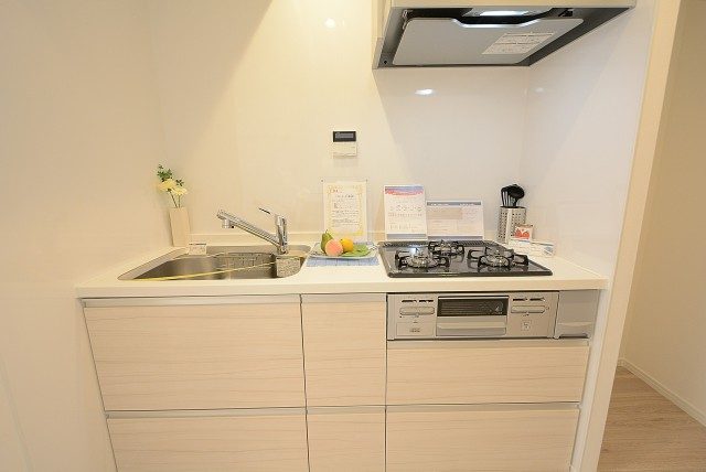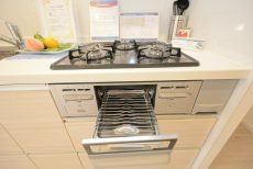 コンロは3口、グリル付き。グリルって魚イメージが強いですが、他の食材でも活躍出来るんですよ。是非使ってみてください。ただし、使う時は換気扇をお忘れなく!少し前から回し始めると効果的らしいですよ。