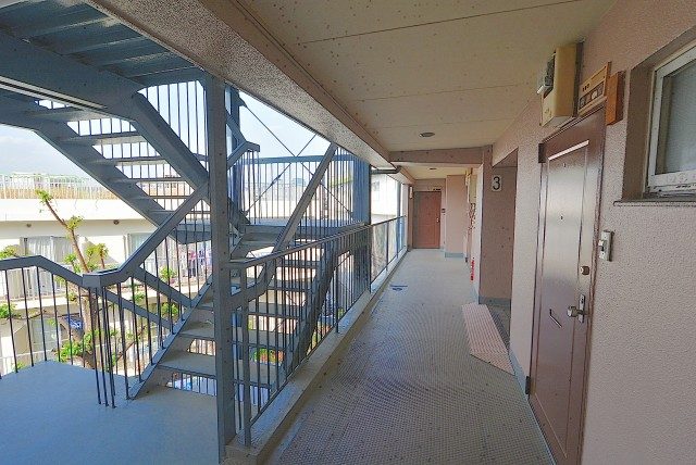 このマンションはエントランスが2階にあるので、エレベーターは使わずそのまま廊下を進みます。表側の道路と同じ高さということになるので、実質的には1階ですね。