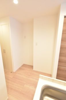 廊下へ戻ろうと思ったら、開けたドアの陰に扉を発見!中は洗濯機スペースでした。棚も付いているので、洗剤などはこちらにまとめて置くことが出来ます。