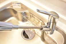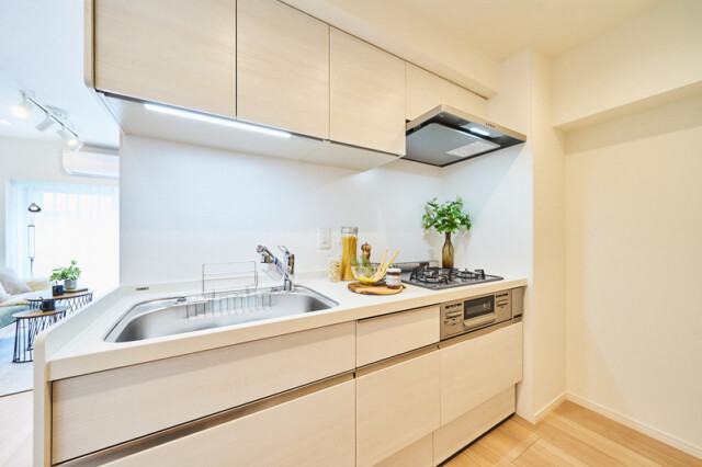 キッチンはL字型のお部屋の折れ曲がった部分、リビングからは隠れた所にあります。寛ぎの空間からは目立たず、ダイニングとの行き来はスムーズという絶好のポジションですね。調理台にはLIXIL製のシステムキッチン。吊戸棚も付いて収納も充実しています。水栓は浄水器一体型なので美味しいお水も使いたい放題ですよ♬