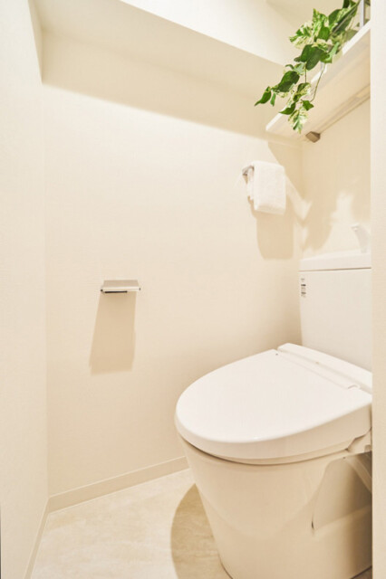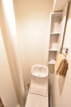 トイレはLIXIL製のシャワートイレ付。上部に棚も設置され、トイレットペーパーのストックなどに便利です。