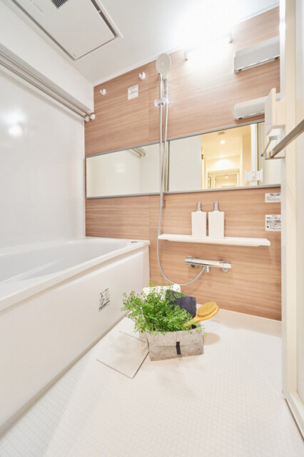 浴室は木目のアクセントパネル使用の温かみのある雰囲気。ほっと出来る安らぎの空間って感じですね。TOTO製追い炊き機能付ユニットバスはスイッチひとつでお風呂をはり、そのまま保温もしてくれるのでいつでも温かいお風呂に入れます。床は水はけがよく、浴室換気乾燥機と併せればカビの発生もかなり抑えられますよ。
