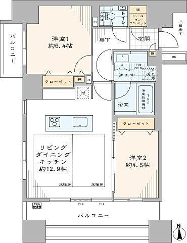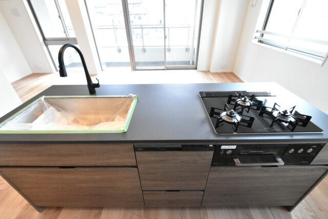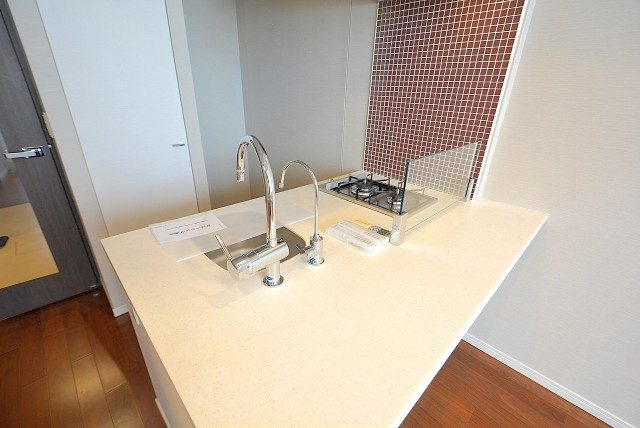 キッチンには、浄水機能付きの水栓、2口のガスコンロが付いています。