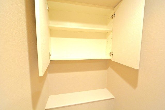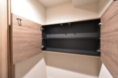 吊戸棚が付いているので、トイレットペーパー等の消耗品や掃除用品などは人目につかないこちらに収納しておくことができます。