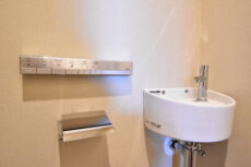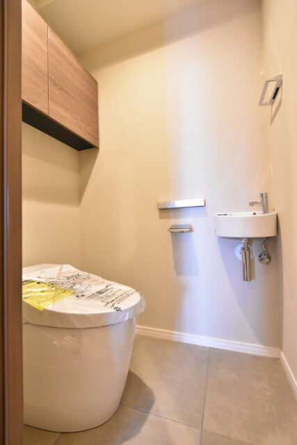 洗浄便座はTOTO製のウォシュレット。手洗いボウルも付いていますよ。私は手洗いボウルのことを「高級物件の証」と呼んでいます(笑)