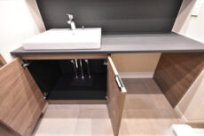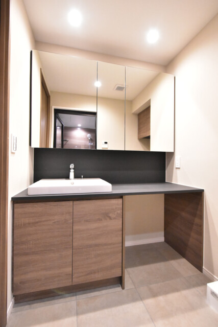 洗面ボウルの周りのドライスペースは広くとってあるので、基礎化粧品などを置いておくこともできますし、ちょっとした小物の仮置きにも役立ちます。
