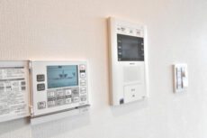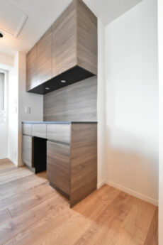 シックな玄関はアルコーブ付き。ドア横にはモニター付きインターホンが設置されていて、お部屋の中から訪問者を確認する事が出来ます。手が離せない時などには、わざわざ玄関まで来なくていいのは大いに助かります。