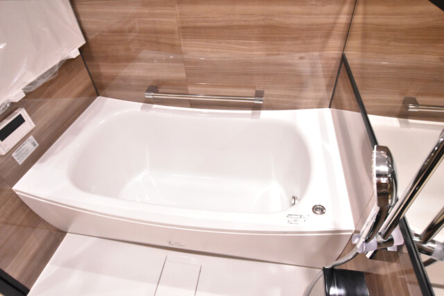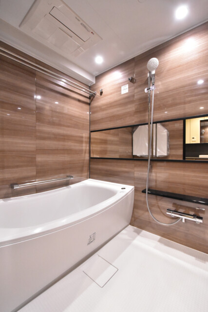 浴室は、ダークブラウンの鏡面パネル使用で落ち着いた雰囲気。壁に映ったライトが綺麗ですね。リラックスタイムにはピッタリです♬