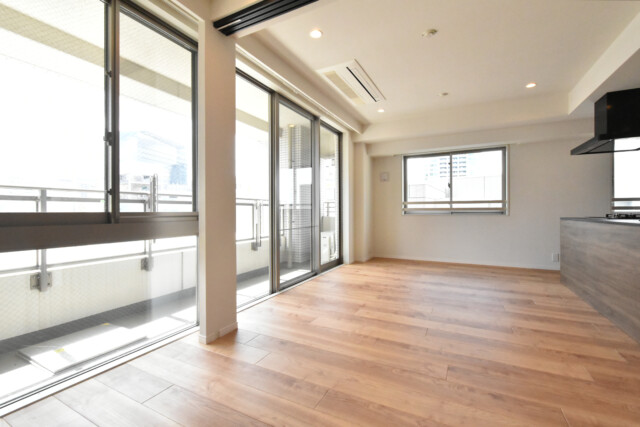 角部屋らしく、窓がたくさんある明るいお部屋です。南側にはバルコニーに面した大きな窓、西側には腰高窓が二か所。二面に窓があることによって明るさはもちろん風通しも良くなっています。