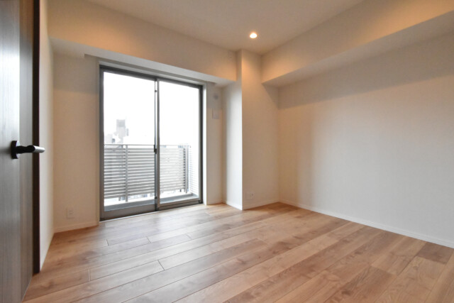 廊下に面した独立性の高いお部屋です。何といっても先程の洋室はガラス張りでしたからそれと比べれば…(笑)LDKと同じナチュラルテイスト。家具も合わせやすそうですね。コンパクトですが西向きのバルコニーも付いています。