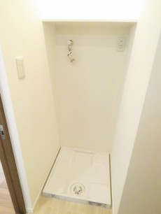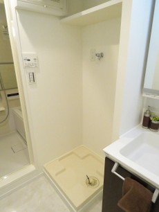 洗面化粧台のお隣は洗濯機置場。上には物が置けるよう棚が設置されています。