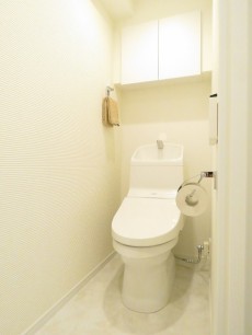 トイレはウォシュレット付き。クロスも収納棚も白で清潔感たっぷり。