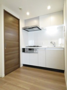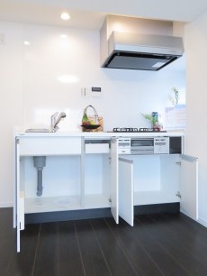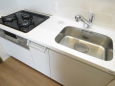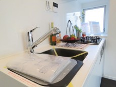 キッチンの水栓は浄水機能付き、コンロは3口ガスコンロ。キッチン横の壁面には棚付の収納が設けられているのでパントリー代わりに使うのもよさそうです。