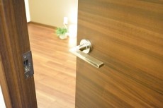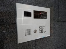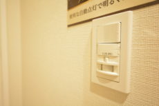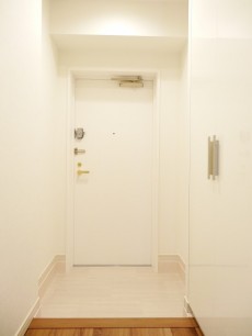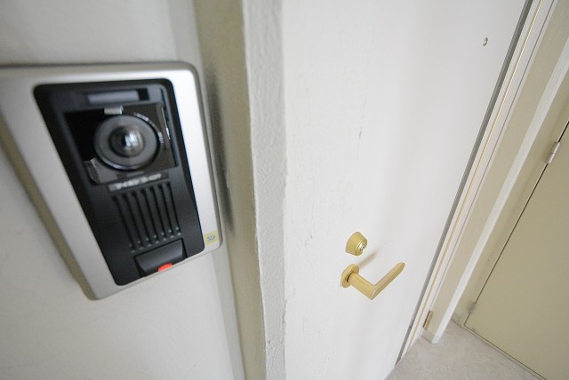 お部屋はホールから外に出た所。玄関ドア横にはモニター付きインターホンが設置されていて、お部屋の中から訪問者を確認する事が出来ます。オートロックは付いていますが、応対する前に映像で確認出来れば更に安心ですね。