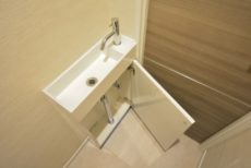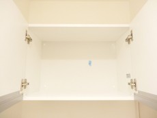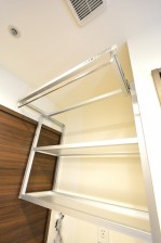 上には吊り棚が設置されているのでペーパーのストックや掃除用具もスッキリ収納いただけます。